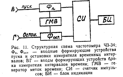 Рассмотрим принцип работы частотомера ЧЗ-34.Этот прибор измеряет интервалы времени. Между импульсами различной полярности от 0,1 до 100 с. Структурная схема частотомера ЧЗ-34 представлена на рис. 11. Содержит следующие блоки: