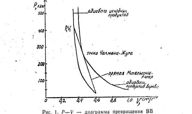 Если процесс детонации стационарен, то переход от исходного вещества к адиабате продуктов взрыва совершается по прямой линии, соединяющей точки Р1