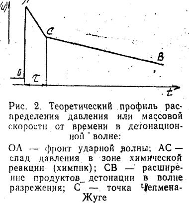 Взрывчатые вещества (ВВ) — это вещества, способные к экзотермическому превращению, .которое передается от реагирующего слоя .к близлежащему, распространяясь в виде волны по всему заряду ВВ. Для того чтобы процесс, именуемый детонацией, оказался принципиально возможным, .необходимо, чтобы реакция экзотермического превращения протекала за чрезвычайно короткое время. Такие времена реакции, порядка 1 мкс, возможны лишь при очень высоких давлениях, при которых волны сжатия всегда трансформируются в ударные волны. Таким образом, детонацию можно представить себе как совокупное действие ударной волны и химической реакции, при которой ударный импульс инициирует реакцию, а энергия реакции поддерживает амплитуду волны, (скорость детонации различных ВВ составляет от 1500 до 10000 м/с), а давление непосредственно за фронтом волны —