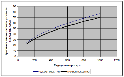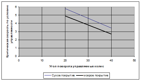При увеличении угла поворота управляемых колёс критическая скорость по условию управляемости падает. Тип покрытия также влияет на критическую скорость по условию управляемости: на асфальтобетонном сухом покрытии критическая скорость больше чем при гололеде.