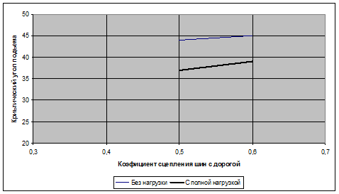 Изменение коэффициента сцепления шин с дорогой способствует и изменению критического угла подъёма. Для асфальтобетонного и цементобетонного покрытий критический угол подъёма минимальный, а при гололёде максимальный. Для порожнего автомобиля критический угол подъёма больше чем для автомобиля в груженом состоянии, однако для укатанного снега и обледенелой дороги критический угол подъёма для автомобиля в груженом состоянии больше чем для автомобиля в порожнем состоянии.