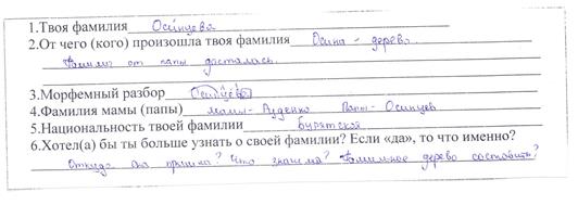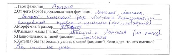 Из 56 опрошенных, только 14 примерно знали своём происхождение своей фамилии, остальные же оставались в неведенье. По происхождению - фамилии в большинстве были русские, но также встречались: украинские и кумандинские, бурятские и польские. При морфемном разборе и анализе происхождения фамилии, ребята находили основу, напрямую указывающую на источник образования и фоносемантическую особенность. Например: