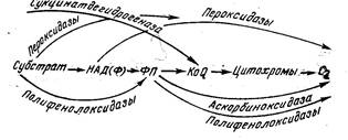 Кроме того, в клетках имеются альтернативные окислительные механизмы, образующие сопряженные цепи с флавопротеиновыми ферментами и цитохромами. Среди них главную роль играют оксидазы, содержащие в молекуле ионы железа или меди.