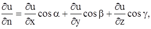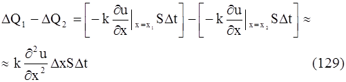 Рассмотрим процесс распространения тепла в трехмерном пространстве. Пусть u(x, y, z, t) – температура в точке с координатами (x, y, z) с момент времени t. Опытным путем установлено, что скорость прохождения тепла через площадку ∆s, т. е. количество тепла, протекающего за единицу времени, определяется формулой (аналогично формуле (126))