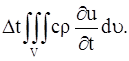 где с – теплоемкость вещества, ρ – плотность. Общее количество тепла, затраченное на повышение температуры в объеме V за время ∆t, будет