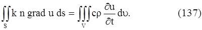 где n – единичный вектор, направленный по внешней нормали к поверхности S. Очевидно, что формула (136) дает количество тепла, поступающего в объем V(или уходящего из объема V) за время ∆t. Количество тепла, поступившего в объем V, идет на повышение температуры вещества этого объема.