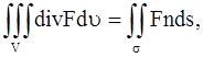Поверхностный интеграл, стоящий в левой части этого равенства, преобразуем по формуле Остроградского (в векторной форме, где F – дивергенция векторного поля, σ – замкнутая поверхность)