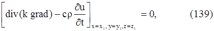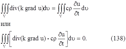 Так как мы можем выделить произвольный объем V в трехмерном пространстве, где происходит распространение тепла, и так как мы предполагаем, что подынтегральная функция в равенстве (138) непрерывна, то равенство (139) будет выполняться в каждой точке пространства. Итак,