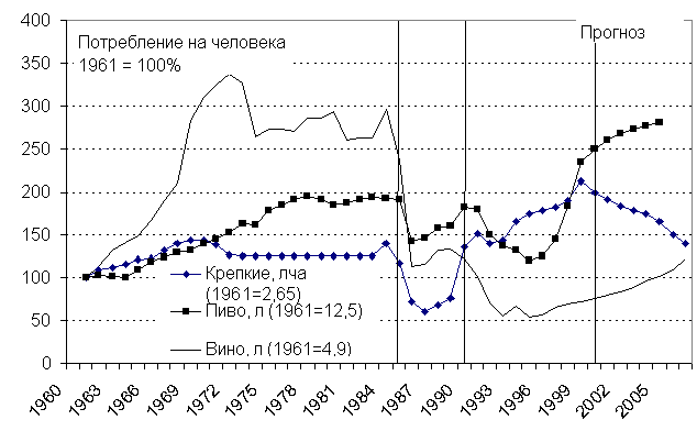 При этом потребление пива и вина снижалось. В итоге, к середине 90-х годов потребление пива практически достигло уровня 1960 года, а потребление вина относительно 1960 года упало практически в 2 раза.