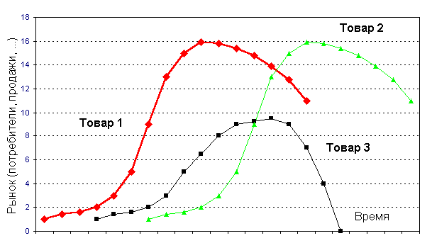 График иллюстрирует весьма обычную ситуацию успешной компании. Не все товары компании, не все марки могут развить продажи на рынке. Именно поэтому жизненно важно для каждой компании иметь в своем ассортименте несколько позиций. <BR&NBSP; >Например, Товар 2 может оказаться очень успешным, сменив предыдущего лидера или версию, например Товар 1. Другие товары, например Товар 3, после кратковременного взлета могут оказаться ненужными на рынке.