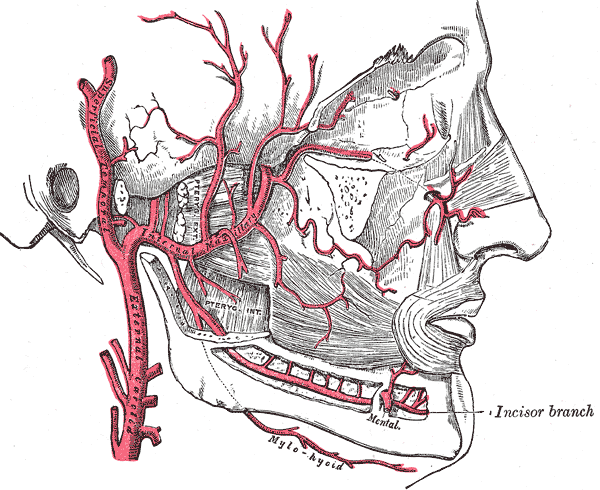 , а. mentalis, которая ветвится в мимических мышцах и в коже подбородка. До входа в канал от нижней альвеолярной артерии ответвляется тонкая челюстно-подъязычная ветьвь,
