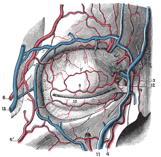 1 – надглазничная артерия и вена, 2 – артерия носа, 3 – угловая артерия (конечная ветвь лицевой артерии – 4), 5 – надглазничная артерия, 6 – передняя ветвь поверхностной височной артерии, 6’ – ветвь поперечной артерии лица, 7 – слезная артерия, 8 – верхняя артерия века , 9 – анастомозы