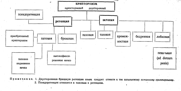 В практическом отношений целесообразно выделить приобретенный крипторхизм, который можетявиться следствием травмы, неудачного оперативного вмешательства, ношения бандажа.