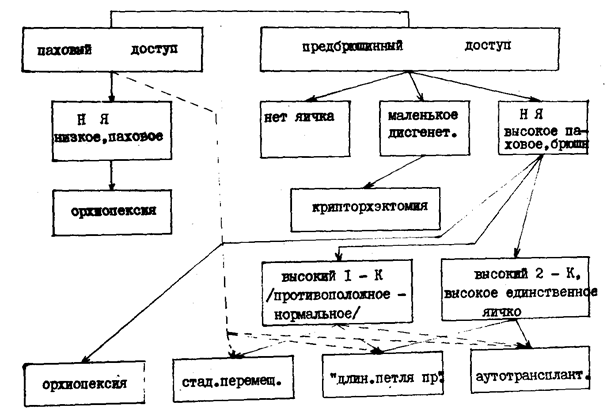 Считают, что у мальчиков до возраста половозрелости крипторхэктомия показана: 1) при гипоплазии, атрофии неопущенного яичка; 2) При недостаточности длины семявыносящего протока, что препятствует низведению яичка; 3) при коротких элементах семенного канатика с нарушенным урогентиальным соединением. У больных других возрастных групп показания к первичной крипторхэктомии следующие: 1) односторонний крипторхизм у больных старше 20 лет; 2) подозрение на малигнизацию. Следует не забывать, что о возможности орхиэктомии родители мальчика должны быть информированы до или даже во время операции.