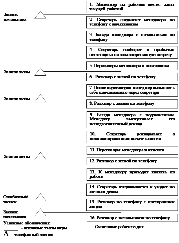 ). Выполняет определенный объем работы в ходе игры, по возможности не отвлекаясь на посторонние разговоры, посетителей, телефонные звонки и т.д. В течении рабочего дня он принимает оперативные управленческие решения, выполняет возложенные на него обязанности в соответствии с занимаемой должностью. В качестве индивидуального задания менеджер отвечает на вопросы тестов, решает задачи, предложенные преподавателями. В течении рабочего дня у менеджера заранее запланирована встреча с представителем фирмы-поставщика. Целью переговоров является заключение договора поставки какого-либо товара на взаимовыгодных условиях. В переговорах принимает участие подчиненный-работник отдела, возглавляемого менеджером В ходе игры менеджер может делегировать выполнение отдельных задач подчиненному и секретарю.