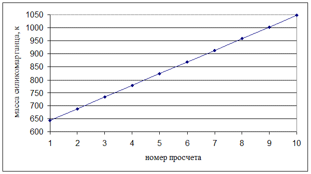 Рисунок 5.40 - Зависимость коэффициента угара кремния от угоревшей массы кремния, т