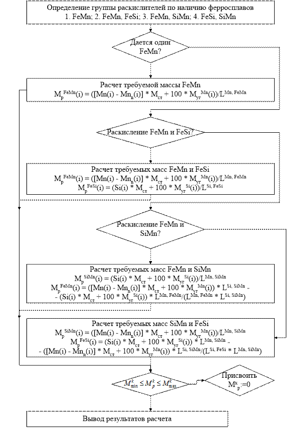В дипломном проекте предложен вариант решения такой задачи путем расчета раскислителей и легирующих не по эмпирическому коэффициенту угара, имеющему слабую технологическую и управленческую интерпретацию, а по угару элементов, который более плотно и точно характеризует процесс раскисления и легирования. Кроме того, для подстройки коэффициентов определения угоревших масс используется процедура их адаптации. Оптимизация процесса состоит в введении в сталь необходимых масс элементов с учетом их угара, имея при этом более экономичную технологию процесса раскисления и легирования стали, более высокие свойства проката. Оптимизация процесса раскисления и легирования осуществляется процедурой минимизации критерия, имевшего в своем составе ценовую составляющую и составляющие, определяющие отклонение расчетного состава стали от заданного. Причем коэффициенты при соответствующих составляющих являются подстраиваемыми и можно путем их изменения ориентировать расчетный алгоритм как на более экономичную технологию, так и на получение высоких и механических свойств проката.