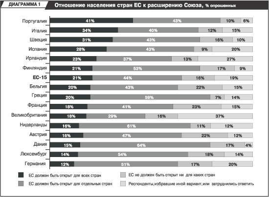 По последним данным «Евробарометра», отношение населения стран ЕС к расширению Союза неоднозначно и далеко от единодушной поддержки этого процесса. 43% населения стран ЕС согласно с тем, что Союз должен расширяться за счет новых стран-членов; в то же время, 35% опрошенных не поддерживают процесс расширения. Любопытно, что большинство сторонников расширения ЕС живут преимущественно в странах с относительно низким уровнем экономического развития (Греция, Ирландия, Испания, Португалия). Зато в странах — лидерах ЕС (Великобритания, Германия, Франция), заметно влияющих на определение стратегии ЕС, доля сторонников расширения лишь немногим превышает треть. Довольно сдержанно относятся граждане ЕС к возможности получения членских билетов в Евросоюз. Лишь пятая часть респондентов (21%) считают, что ЕС должен быть открытым для всех желающих, а почти половина (44%) допускают такую возможность лишь для отдельных государств (диаграмма
