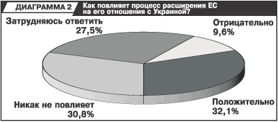 Любопытны также взгляды населения Украины, к границам которой приближается ЕС. Наши соотечественники оценивают процесс расширения ЕС сдержанно позитивно. Наибольшая часть населения (32,1%) уверена, что расширение ЕС улучшит его отношения с Украиной. Только каждый десятый (9,6%) придерживается противоположной точки зрения (диаграмма