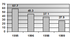 Диаграмма 1. Динамика числа малых предприятий России, воспользовавшихся ссудами банков в период 1995-1999 гг. (в процентах).2