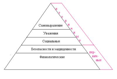 Иерархия человеческих потребностей сформулирована американским ученым Маслоу (см. рис.1). По мере удовлетворения потребностей одного уровня они перестают служить мотиваторами, и возникают новые потребности более высокого уровня. Материальные потребности (первые два уровня) постепенно сменяются духовными (последние три уровня). Поскольку с развитием человека как личности расширяются его потенциальные возможности, потребность в самовыражении никогда не может быть полностью удовлетворена. Поэтому и процесс мотивации поведения через потребности бесконечен. Для того чтобы мотивировать конкретного человека, руководитель должен дать ему возможность удовлетворить его важнейшие потребности посредством такого образа действий, который способствует достижению целей всей организации.