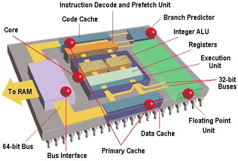 - Ядро: Сердце современного процессора - исполняющий модуль. Pentium имеет два параллельных целочисленных потока, позволяющих читать, интерпретировать, выполнять и отправлять две инструкции одновременно.