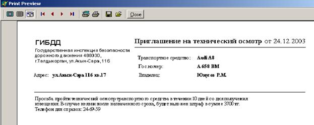 Во втором подпункте меню «Работа», ведется работа с владельцами транспортных средств, просрочивших дату тех.осмотра. Имеется возможность поиска владельца по фамилии, а также возможность печати приглашения на технический осмотр транспортного средства. Вид окна печати данного приглашения приведен на рис. 4.