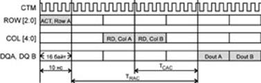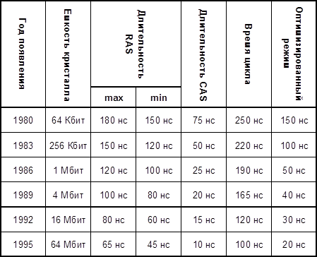 - количества тактов системной шины, необходимых для доступа к случайно выбранному адресу и следующим за ним адресам. Характерные диаграммы для разных типов памяти (в предположении, что они достаточно быстры, чтобы оптимально взаимодействовать с шиной) - 5-3-3-3 (fast page), 5-2-2-2 (EDO), 5-1-1-1 (SDRAM).