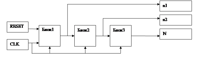 Сигнал «сброс» для второго блока (Блок2) берется с выхода Q предпоследнего триггера линии задержки блока (Блок1) (для совпадения среза сигнала с первого блока (Блок1), и фронта, сигнала со второго блока (Блок2)). Сигнал «n2» формируется с 6 (шестого) триггера Блока (Блок2) аналогично формированию сигнала «n1». Линия задержки сформирована на четырех D – триггерах.