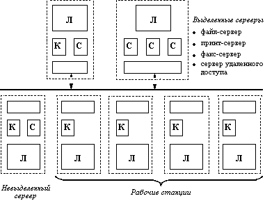 Корпоративная сетевая ОС должна поддерживать более сложные сервисы. Подобно сетевой ОС рабочих групп, сетевая ОС масштаба предприятия должна позволять пользователям разделять файлы, приложения и принтеры, причем делать это для большего количества пользователей и объема данных и с более высокой производительностью. Кроме того, сетевая ОС масштаба предприятия обеспечивает возможность соединения разнородных систем - как рабочих станций, так и серверов. Например, даже если ОС работает на платформе Intel, она должна поддерживать рабочие станции UNIX, работающие на RISC-платформах. Аналогично, серверная ОС, работающая на RISC-компьютере, должна поддерживать DOS, Windows и OS/2. Сетевая ОС масштаба предприятия должна поддерживать несколько стеков протоколов (таких как TCP/IP, IPX/SPX, NetBIOS, DECnet и OSI), обеспечивая простой доступ к удаленным ресурсам, удобные процедуры управления сервисами, включая агентов для систем управления сетью.