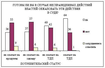 Хотя верят в судебную защиту от произвола властей только 23% россиян, тогда как готовы обжаловать в суде несправедливые действия властей почти вдвое больше - 43%! В том числе большинство (58%) среди молодежи до 30 лет; двое из трех (64%) материально обеспеченных россиян.