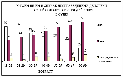 Если к результатам этого опроса можно относиться с недоверием, то опрос ВЦИОМ ( (http://www.wciom.ru/ ) 21-25 марта 2003 года, в котором учавствовало 1600 человек от 18 лет и старше, показал, что есть много причин для того, чтобы не обжаловать несправедливые действия властей в суде. Некоторым россиянам это просто не приходит в голову (6%), некоторые не знают, как это сделать (8%), для кого-то не по нутру сама судебная волокита (10%). Это психологические причины. Встречаются и опасения преследований со стороны власти, обоснованный или необоснованный страх сделать себе еще хуже (6%). Чаще всего, однако же, причина видится в пристрастности самого суда, заведомой безрезультатности обжалования (46%). Только один из четырех россиян (23%) верит, что при обжаловании в суде несправедливых действий властей удастся восстановить справедливость.