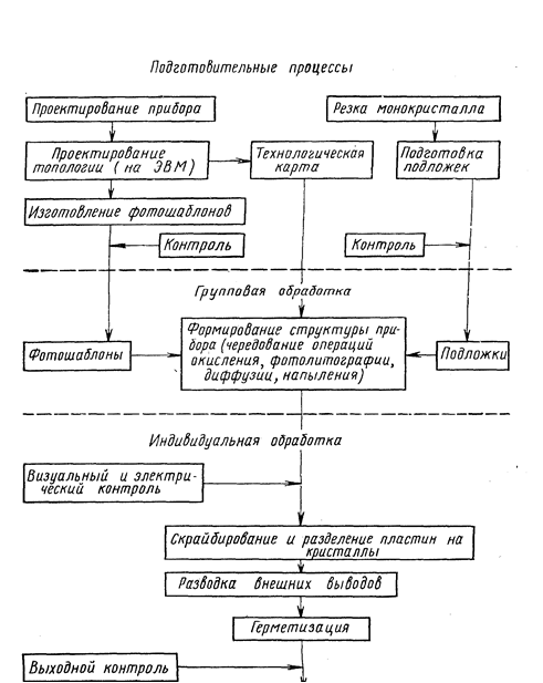 Îáùàÿ òåõíîëîãè÷åñêàÿ ñõåìà ïðîöåññîâ ïðîèçâîäñòâà ïîëóïðîâîäíèêîâûõ ïðèáîðîâ ïîêàçàíà íà ðèñ. 1. Îíà âêëþ÷àåò êîìï ëåêñû ïîäãîòîâèòåëüíûõ ïðîöåññîâ, ïðîöåññîâ ãðóïïîâîé è èíäèâèäóàëüíîé îáðàáîòêè.