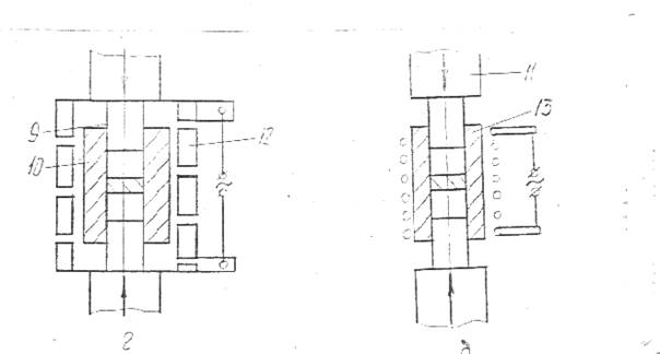 б- прямой нагрев при подводе тока к пуансону,в- прямой нагрев при подводе тока к