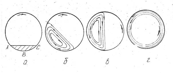 Рис1.Схемы движения шаров в мельнице:а-режим скольжения,б-режим перекатывания, в-режим свободного скольжения,г-режим критической скорости.