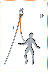 Первый в связке начинает двигаться вверх. При этом он организует точки страховки. Как часто их надо делать? Здесь нужно иметь представление о факторе рывка и о том, на какой веревке ты работаешь. Если веревка удовлетворяет требованиям UIAA, это уже хорошо, но это не все. Веревки могут иметь различные значения рывка по тесту UIAA. Чем это значение меньше, тем веревка мягче и рывок будет меньше. Такая веревка предпочтительнее (естественно она будет и дороже). Далее, точки надо делать чаще вначале и допускается делать реже в конце. Например, чтобы фактор рывка был бы не более К=0.5 (в этом случае рывок на веревку будет не более 340 кг при жестком закреплении веревки, которая по тесту UIAA показывает рывок 1200 кг) точки надо располагать на следующих расстояниях от базы: 3, 6, 8, 11, 15, 20, 26, 34, 45 метров.