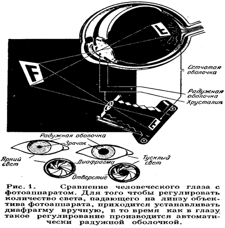 Часто глаз называют живой камерой Обскурой, но как большинство аналогий и эта аналогия верна лишь частично. Глаз представляет собой бесконечно более тонкий и сложный прибор, чем самый лучший фотоаппарат, хотя в принципе они одинаковы. В фотоаппарате, как показано на рис.1, имеется простая собирательная линза или система линз, действующая подобно собирательному хрусталику глаза. Чувствительная плёнка в фотоаппарате соответствует чувствительности к свету сетчатой оболочке на задней стороне глаза; ту и другую получают перевёрнутые, действительные, уменьшенные изображения. Диафрагма регулирует количество света, допускаемого в фотоаппарат; радужная оболочка регулирует количество света, входящего в глаз. В темноте зрачок или отверстие радужной оболочки может иметь диаметр почти 1см, а на ярком свете он имеет размер булавочной головки.