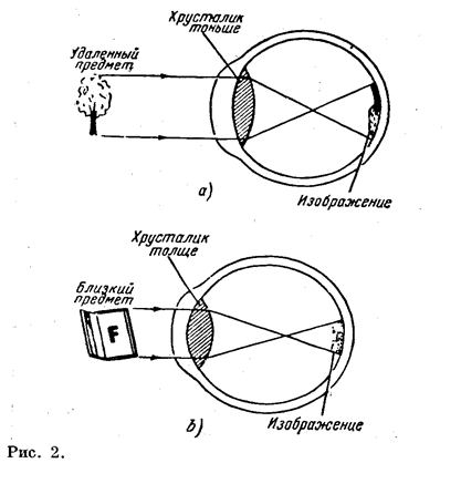 В случае, если предмет приближается к глазу, заставляя увеличиваться расстояние до изображения, хрусталик становится более выпуклым и толстым. Его фокусное расстояние при этом уменьшается так, что расстояние изображения остаётся полным и изображение не сходит с сетчатой оболочки (рис 2,в). Этот процесс, дающий те же самые результаты, что и фокусировка фотоаппарата, называется аккомодацией.