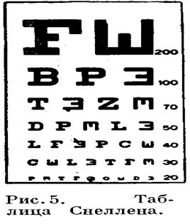 Один из видов проверки на миопию делается при помощи таблицы Снеллена. Таблица Снеллена в уменьшенном виде изображена на рис. 5. При нормальном зрении можно читать седьмую строчку хорошо освещённой таблицы стандартных размеров каждым глазом в отдельности с расстоянием в 50 см. Неспособность сделать это не обязательно свидетельствует о близорукости, так как эта непосредственность может быть вызвана другой причиной. Но если отрицательная (рассеивающая) сферическая линза улучшает видимость (при этом нужно начать с линзы малой оптической силы и постепенно увеличивать силу линзы), то можно предположить наличие близорукости.