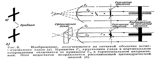 Обычно поверхность роговой оболочки – несколько выступающей передней части глазного яблока – и поверхность хрусталика являются частями почти идеальной сфер. Однако нередко кривизна одной или обоих этих поверхностей оказывается большей в одной плоскости, чем в какой – либо другой. Этот дефект, в результате которого получается нечёткое зрение, называется астигматизмом.