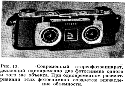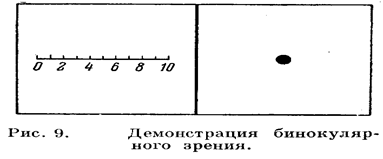 Бинокулярное зрение можно иллюстрировать, расположив небольшой кусок картона перпендикулярно к рис. 9 вдоль его средней линии и приложив нос к верхнему ребру картона, так что каждый глаз будет видеть только половину всего рисунка. В результате этого вы увидите одно трёхмерное изображение, имеющее не только длину и ширину, но и глубину. Другой хорошей иллюстрацией бинокулярного зрения являются старинный стереоскоп. Два изображения одного и того же предмета снимаются одновременно двумя фотоаппаратами, расположенными на расстоянии нескольких сантиметров друг от друга, и готовые фотографии наклеиваются рядом на куске картона. Этот картон вставляется в стереоскоп так, что каждая из фотографий оказывается перед призмой и положительной линзой и каждый глаз видит только одну из фотографий. Положительные линзы несколько увеличивают фотографии, а призмы позволяют слить два изображения. Поэтому обе фотографии представляются в виде одного трёхмерного изображения, обладающего глубиной и всеми свойствами натуры. Видимость глубины объясняется тем, что левое изображение изображает несколько большую часть левой стороны трёхмерного тела, а правое изображение – несколько большую часть правой стороны. Возможно также, что на той или иной фотографии получается несколько большая часть верхней или нижней стороны предмета. При слиянии этих двух слегка различающихся изображений получается эффект глубины.