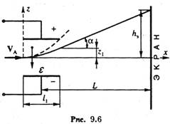 Полное смещение h электрона на плоском экране ЭЛТ, отстоящем на расстоянии L от центра отклоняющих систем (см. рис. 9.6 и 9.7), равно h=tg α. Используя (9.8) и (9.12), можно вычислить смещение луча для электростатической и и магнитной систем отклонения: