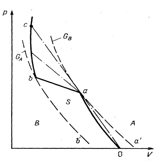 ) - область нестабильности. Состояния в этой области могут быть достигнуты только с помощью двух волновых фронтов; амплитуда из которых соответсвует давлению Pa