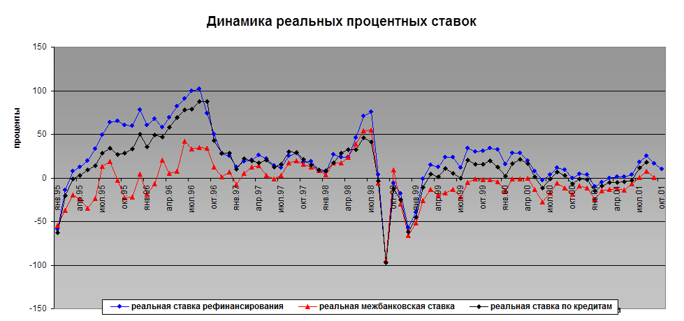 В 1995-1996 годах реальный процент стал не только плюсовым, но и довольно высоким, что постепенно отключало реальную экономику от пользования банковским кредитованием. Этому периоду соответствует положение спада ВВП и промышленного производства не только из-за недостаточного агрегатного спроса, но так же из-за чрезмерной дороговизны кредита. Такая реально жесткая денежно-кредитная политика действительно способствовала снижению инфляции, но при этом убивала реальную экономику и порождала ряд отрицательных явлений в финансовой сфере – нарушение нормального платежного оборота между предприятиями, переход на бартер и коммерческие векселя, а также укрытие денежных доходов от налогового ведомства.
