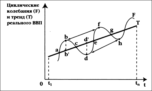 и волнообразная линия (F) отражающая колебания уровня ВВП, вызываемое существованием экономических циклов. Расстояние между точками "пика" bf