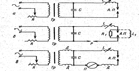 Простейшая схема такого генератора представлена на рис.2а. Она состоит из трансформатора, повышающего напряжение до 10—-18 тыс. В, реостата, регулирующего силу тока в первичной цени трансформатора, переменной емкости на 0,00.1-0,02 мкФ, катушки самоиндукции и аналитического промежутка. Puc.2. Принципиальные cхемы генераторов высоковольтной искры