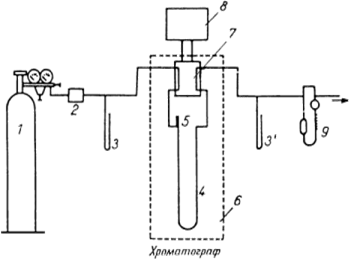 1 – баллон высокого давления с газом-носителем; 2 – стабилизатор потока; 3 и 3 ' – манометры; 4 – хроматографическая колонка; 5 – устройство для ввода пробы; 6 – термостат; 7 – детектор; 8 – самописец; 9 – расходомер