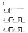 Это операция применяется в случаях, когда требуется иметь противоположные значения переменной. Противоположное значение переменной называется дополнением этой переменной Символически для НЕ оно обозначается чертой над соответствующей переменной величиной: А=Q.   В простейшем случае элемент НЕ инвертор - может быть выполнен на биполярном (или полевом) транзисторе с общим эмиттером (рис. 7, а). Когда на входе А действует сигнал 0, транзистор VT тока" не проводит и напряжение на выходе Q максимально, практически равно напряжению источника питания и соответствует сигналу 1. Если на входе действует положительное напряжение, соответствующее сигналу 1, транзистор VT (n - p - n-типа) отпирается, переходит в режим насыщения и напряжение на выходе Q снижается до уровня 0,1—0,3 В, соответствующее сигналу 0. Таким образом, схема инвертирует входной сигнал. У рассмотренной схемы НЕ много недостатков: малы быстродействие и нагрузочная способность и весьма низка помехоустойчивость. Поэтому на практике используют более сложные схемы. В частности, на рис. 7, б