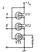 приведен МОП-вариант схемы логического элемента И-НЕ. Транзистор VT1 используется вместо сопротивления нагрузки и постоянно открыт, ибо на его затвор подается напряжение в отпирающей полярности. Если на затворы транзисторов VT2 и VT3 поданы напряжения логического 0, то они заперты, тока не проводят и на выходе Q действует почти полное напряжение питания, т. е. напряжение логической 1. Если подается напряжение логической 1 только на один из входов А или В, то состояние схемы не изменяется и напряжение на выходе остается неизменным. Однако, если на оба входа действуют напряжения логических 1, то оба транзистора VT2 и VT3 отпираются, их внутреннее сопротивление уменьшается (до 500 - 1000 Ом) и напряжение на выходе Q также становится весьма малым, т. е. на выходе действует логический 0 - в полном соответствии с таблицей истинности И-НЕ (табл. 4.).