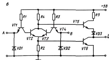 дается схема подобного элемента. Транзисторы VT1 и VT2 имеют р-каналы, вследствие чего, когда на их затворах (входах A, В) действуют сигналы логических 0, они полностью открыты и на выходе Q имеется положительное напряжение логической 1. При этом транзисторы VT3 и VT4 полностью заперты, ибо имеют n-каналы. Когда на оба входа A, В одновременно действуют положительные напряжения логических 1, транзисторы VT1 и VT2 запираются и напряжение с выхода Q снимается. При этом транзисторы VT3 и VT4 отпираются и выход оказывается соединенным с общим проводом через малое сопротивление (500 - 1000 Ом). Если на одном из входов действует напряжение логического 0, а на другом - напряжение логической 1, то один из транзисторов с р - каналом (VT1 или VT2) запирается, но другой остается открытым, и поскольку они включены параллельно, на выходе остается напряжение логической 1. При этом один из транзисторов с n-каналом (VT3 или VT4) оказывается открытым; другой - закрытым, и, поскольку они включены последовательно, шунтирования выхода Q малым сопротивлением не происходит и напряжение на выходе оказывается высоким. Таким образом, сама схема тока не потребляет (разве что в те мгновения, когда происходит процесс ее переключения — но это, в среднем, доли микроватта). ТТЛ-вариант схемы логического элемента И-НЕ дан на рис. 5, в.